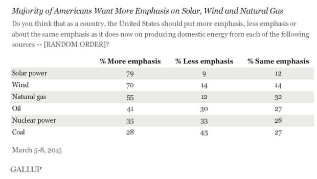 The poll also reveals that majority of Americans believe that the U.S. should shift its focus to green energy and invest in natural gas, solar and wind power. Seventy-nine percent of those surveyed said the country should put greater emphasis on producing solar domestic energy, making it the most favored source in the poll. Wind power was the runner up with 70 percent.