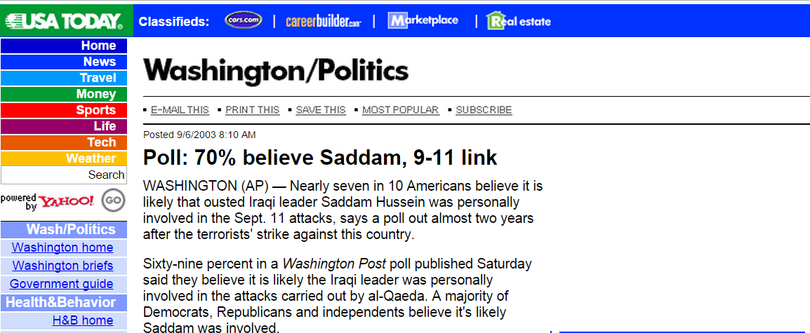 Then there’s the role that U.S. media itself plays in this dynamic. I’ve often cited as the most revealing fact of the post-9/11 era this Washington Post poll from September, 2003 — six months after the invasion of Iraq — which found that “nearly seven in 10 Americans believe it is likely that ousted Iraqi leader Saddam Hussein was personally involved in the Sept. 11 attacks” and that a “majority of Democrats, Republicans and independents believe it’s likely Saddam was involved.”